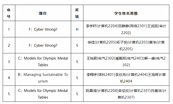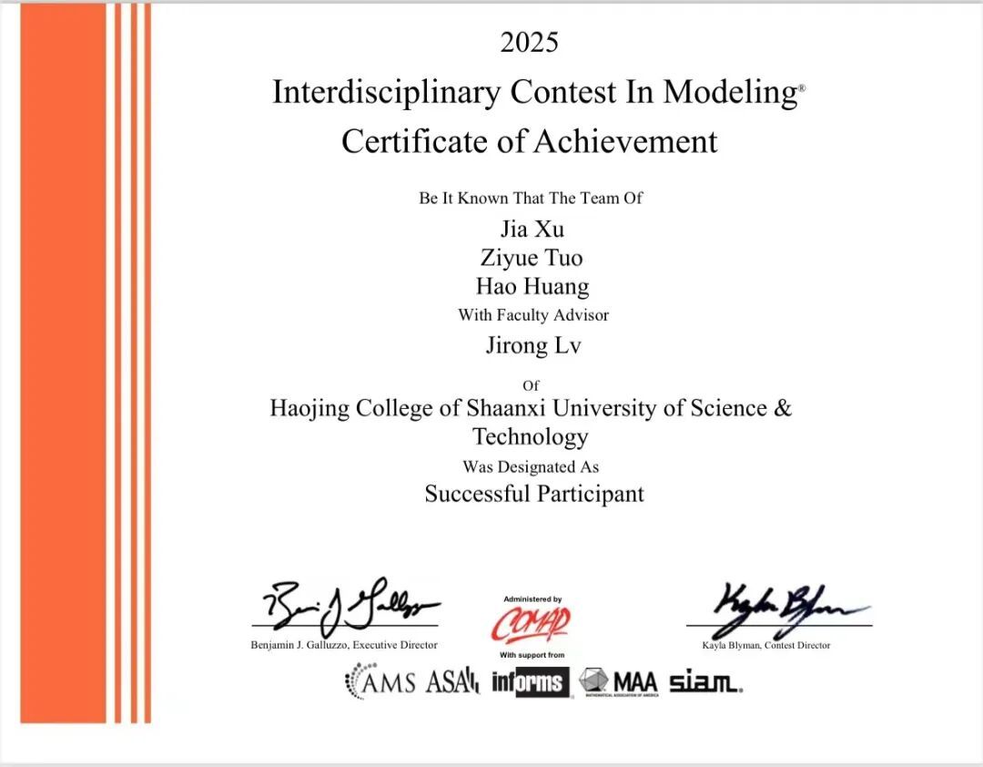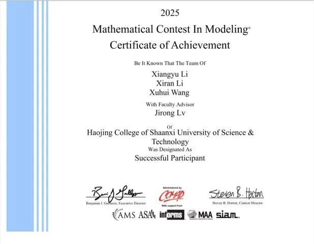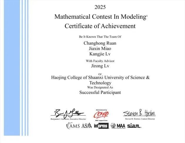 近日,2025年美国大学生数学建模竞赛(MCM/ICM)成绩正式揭晓,我校学子凭借扎实的专业知识、出色的团队协作和创新思维能力,获得Honorable Mention(即H奖)1项、Successful Participant(即S奖)4项,这是我校学子第二次参加该项赛事,共5支队伍参加,获奖率100%。