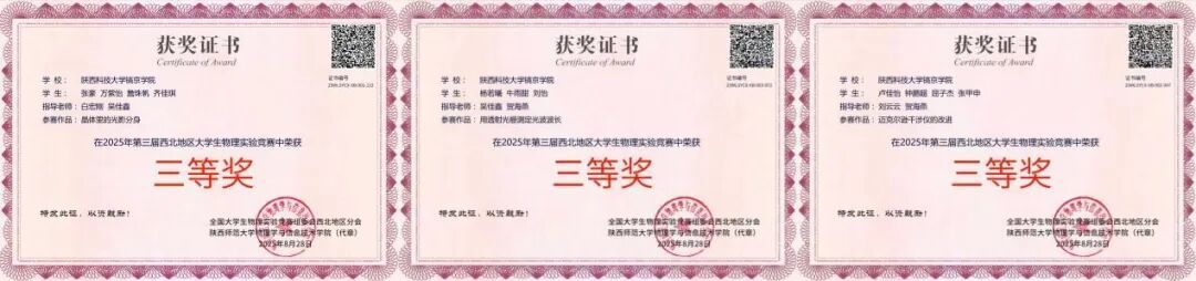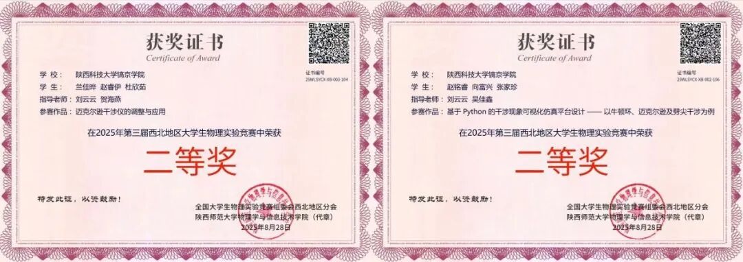 其中,由赵铭睿、向富兴、张家珍同学组成的队伍凭借 “基于Python的干涉现象可视化仿真平台设计” 项目,以及兰佳晔、赵睿伊、杜欣茹同学组成的队伍凭借讲课类项目“迈克尔逊干涉仪的调整和使用”,双双斩获二等奖,成为我校在本次竞赛中的亮眼成果。
