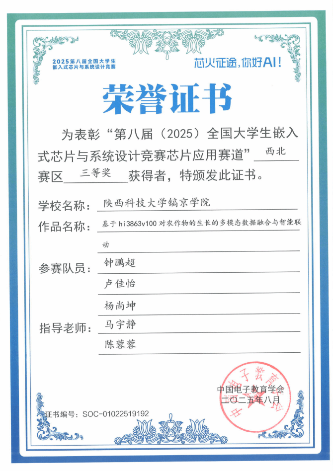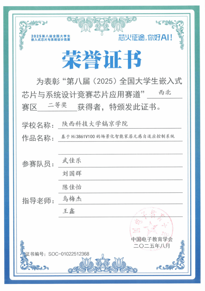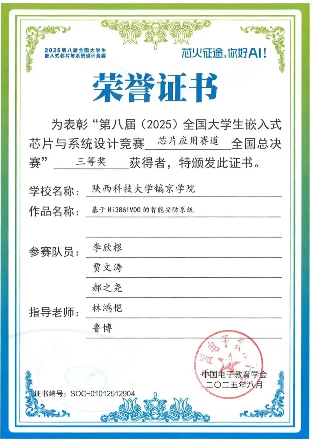 经过作品展示、技术答辩、现场实操等多轮考核,我校参赛团队最终凭借“基于Hi3861V00的智能安防系统”项目斩获全国三等奖。