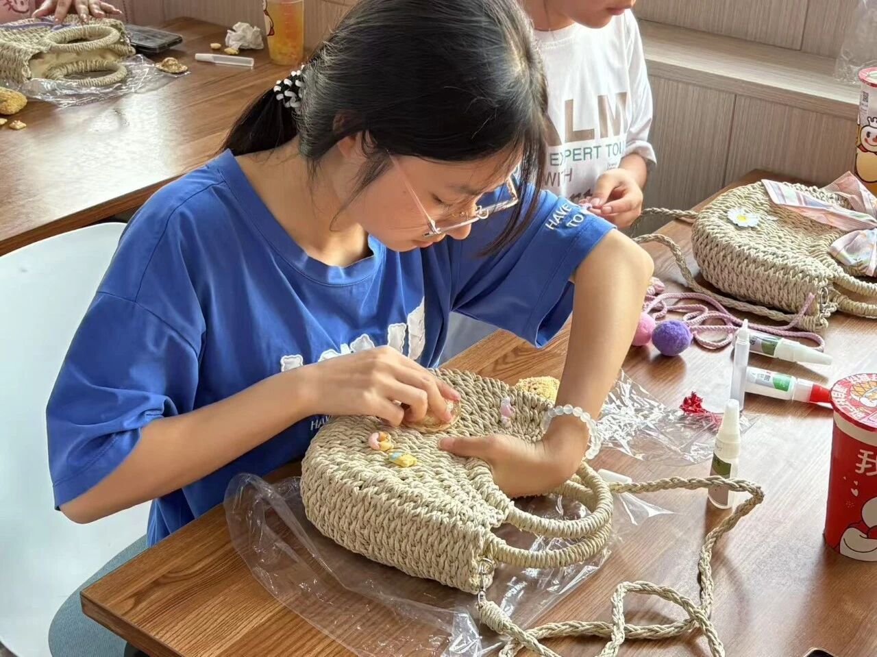 “第一次尝试手工,看似简单却需要十足的耐心。但和伙伴们互相帮助,最终完成作品时特别自豪!”参与同学举着亲手制作的编织包,笑容灿烂。